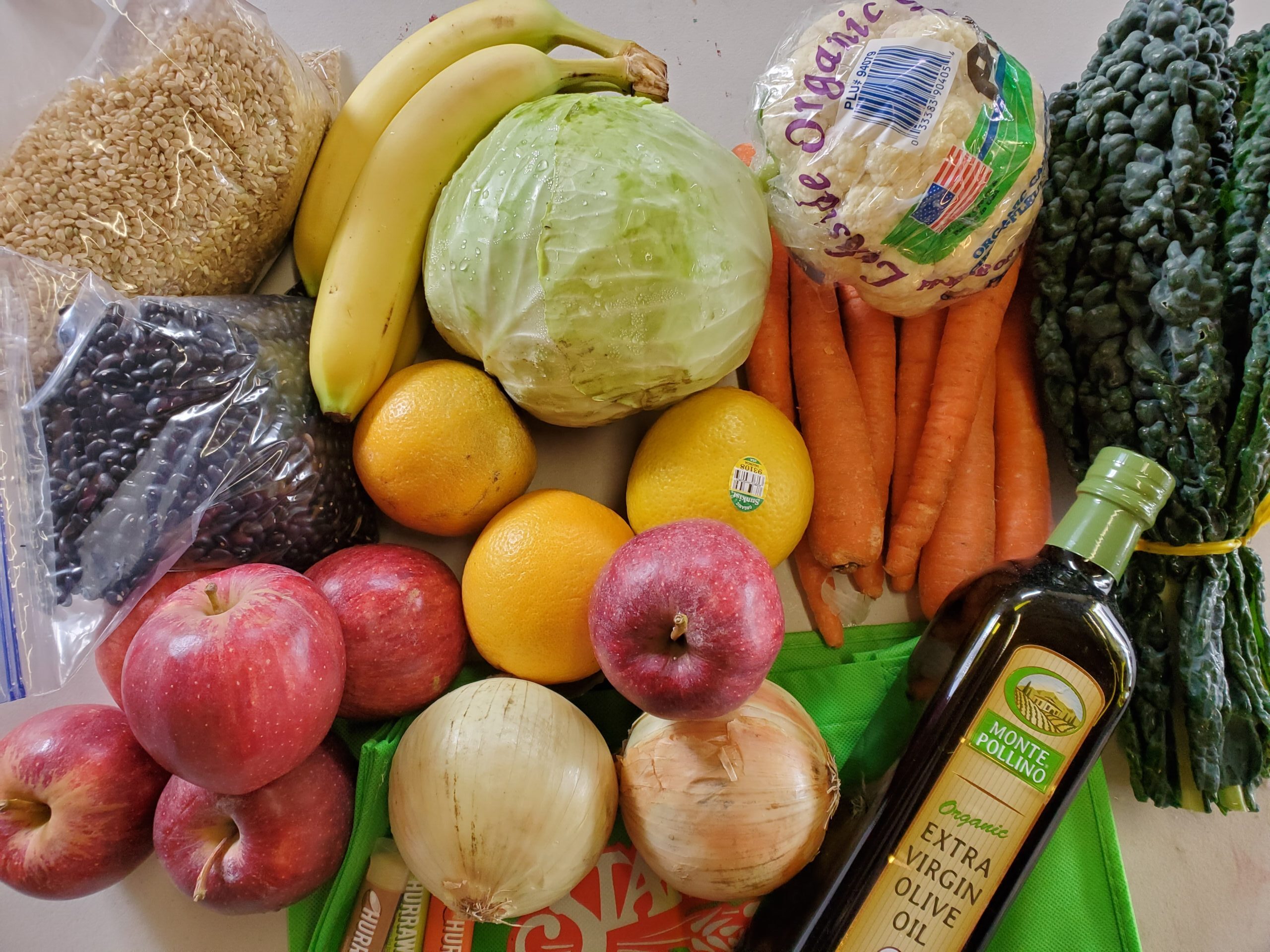 VFA box for families or four: Packed full of organic, healthy, plant-based foods along with recipes and a list of local resources that also help people and pets. Delivered weekly.